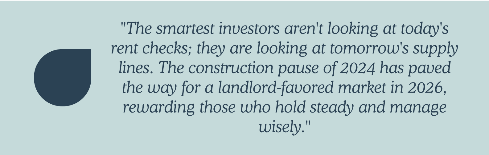 For existing landlords, this is the "Golden Signal." As demand continues to grow (driven by population stability and job growth) and supply flatlines, vacancy rates will compress, and rent growth is projected to accelerate.